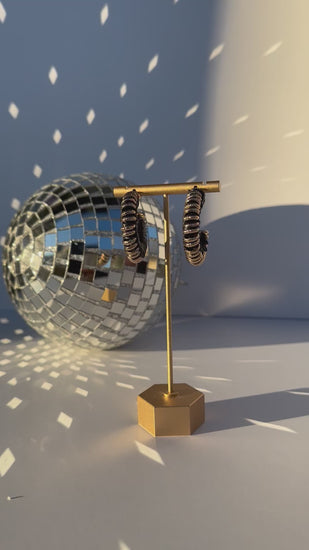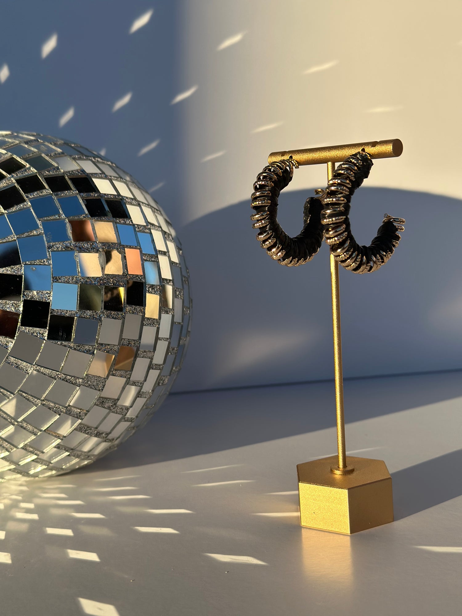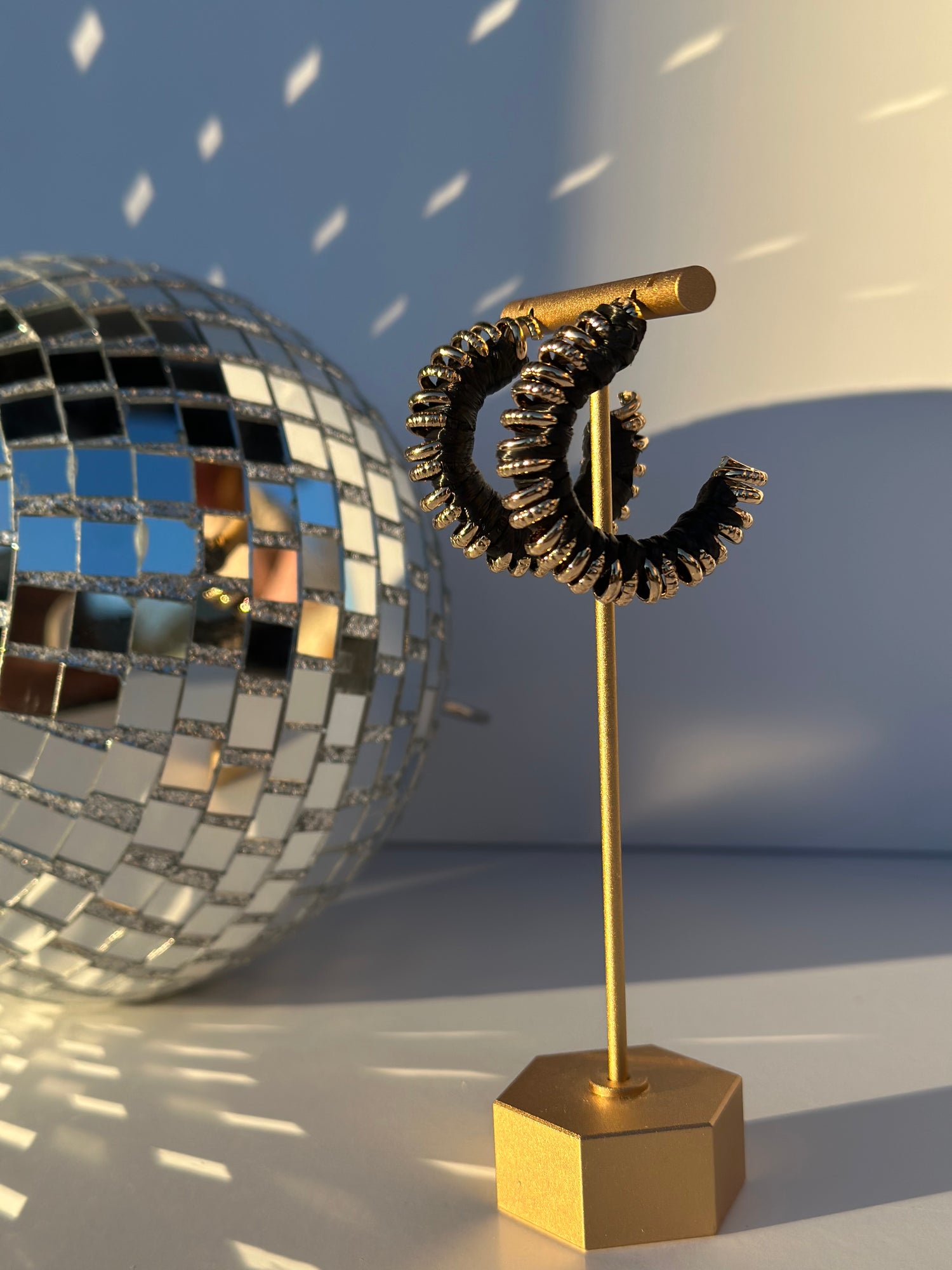 Get in on the hoop trend with these black wrapped metal hoops. These bold and edgy earrings are the perfect accessory to add a touch of attitude to any outfit. Elevate your style with these must-have hoops!