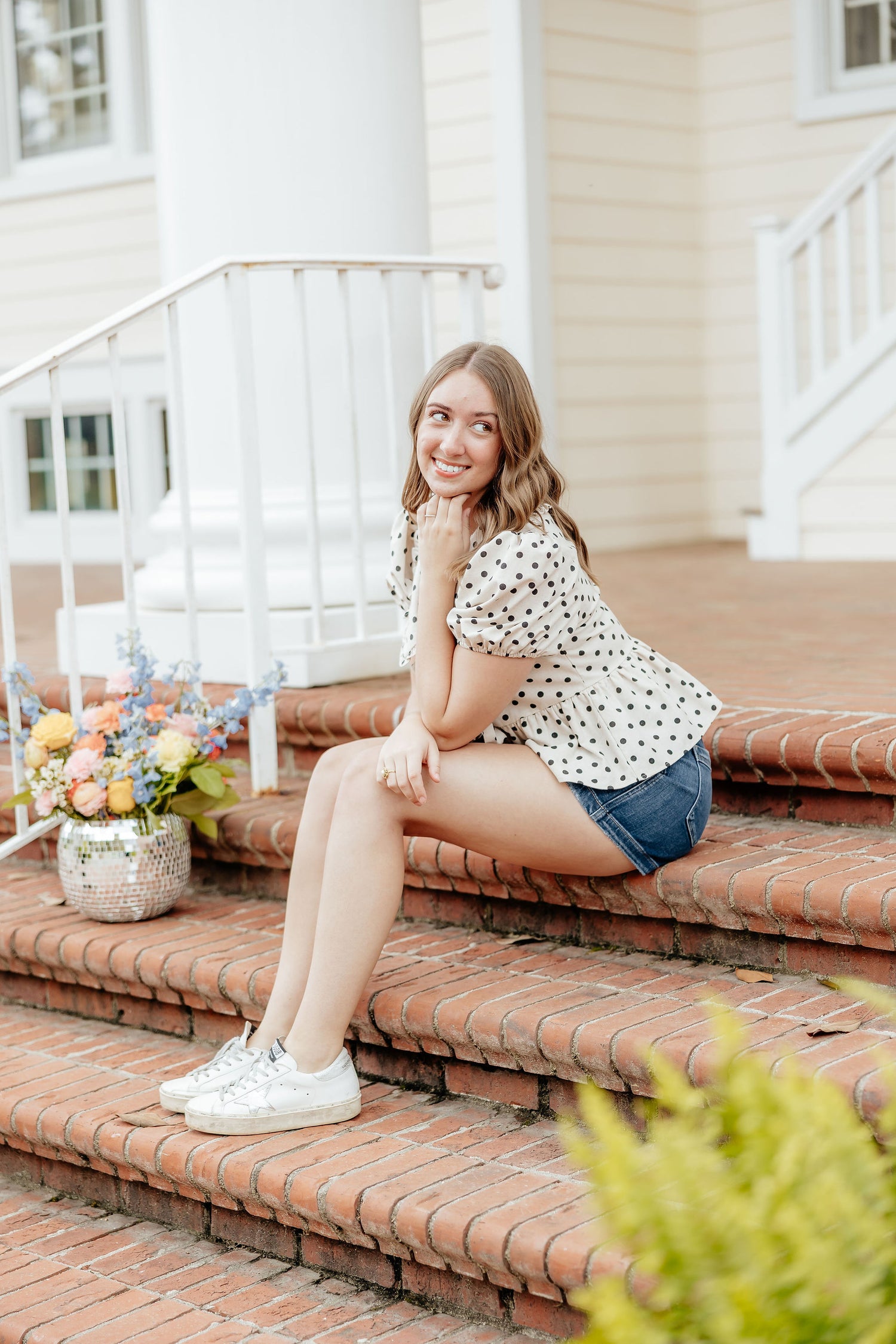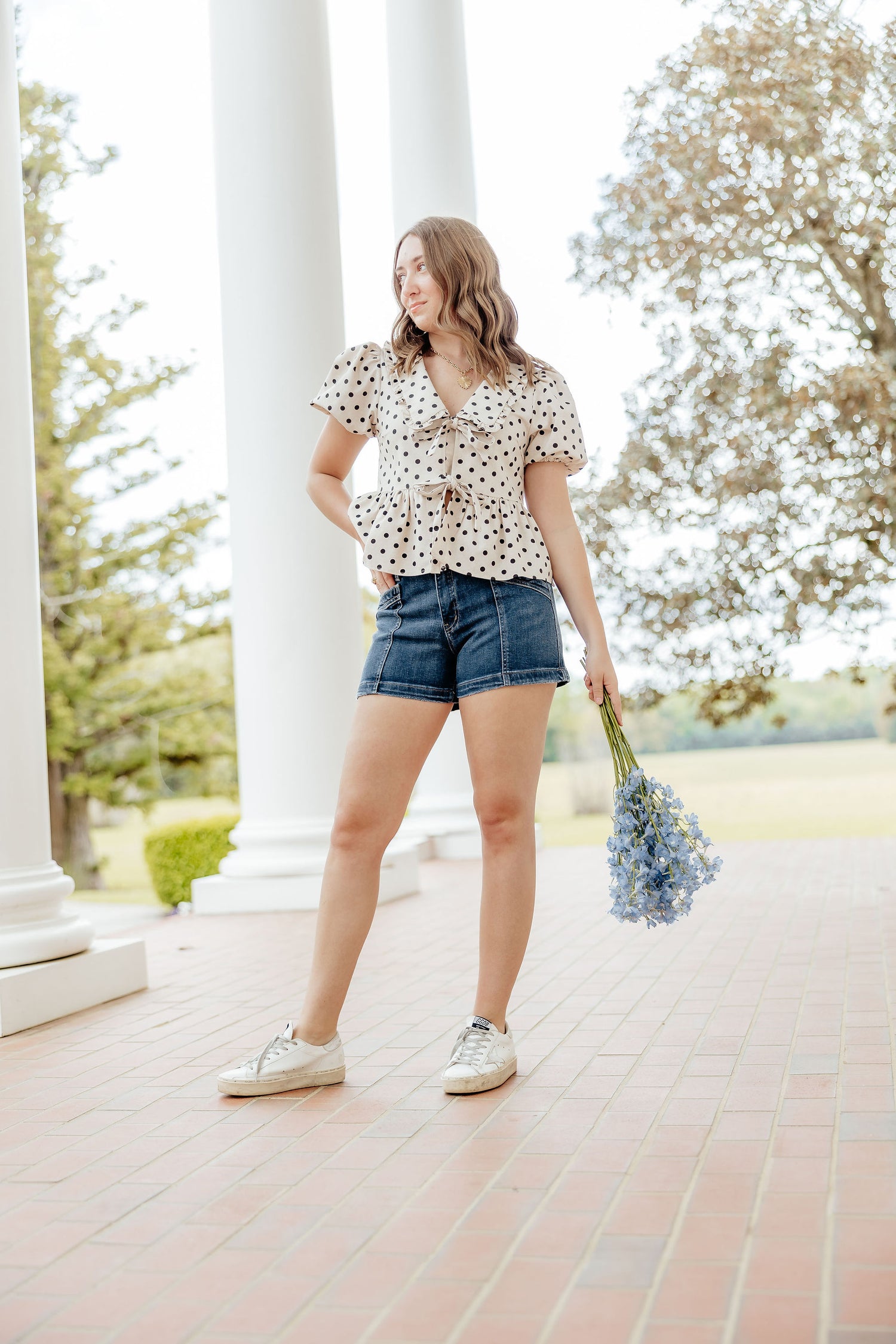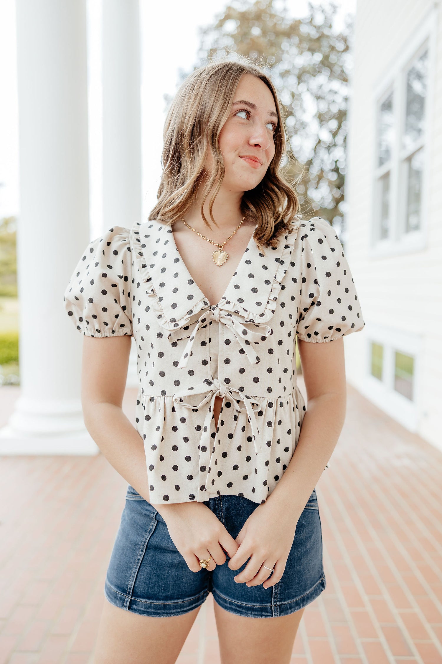 Introducing the Callie top: a perfect addition to your spring wardrobe. Made with high-quality linin fabric, this top features a charming bow detail and a playful polka dot pattern. Expertly crafted for a comfortable and stylish wear.