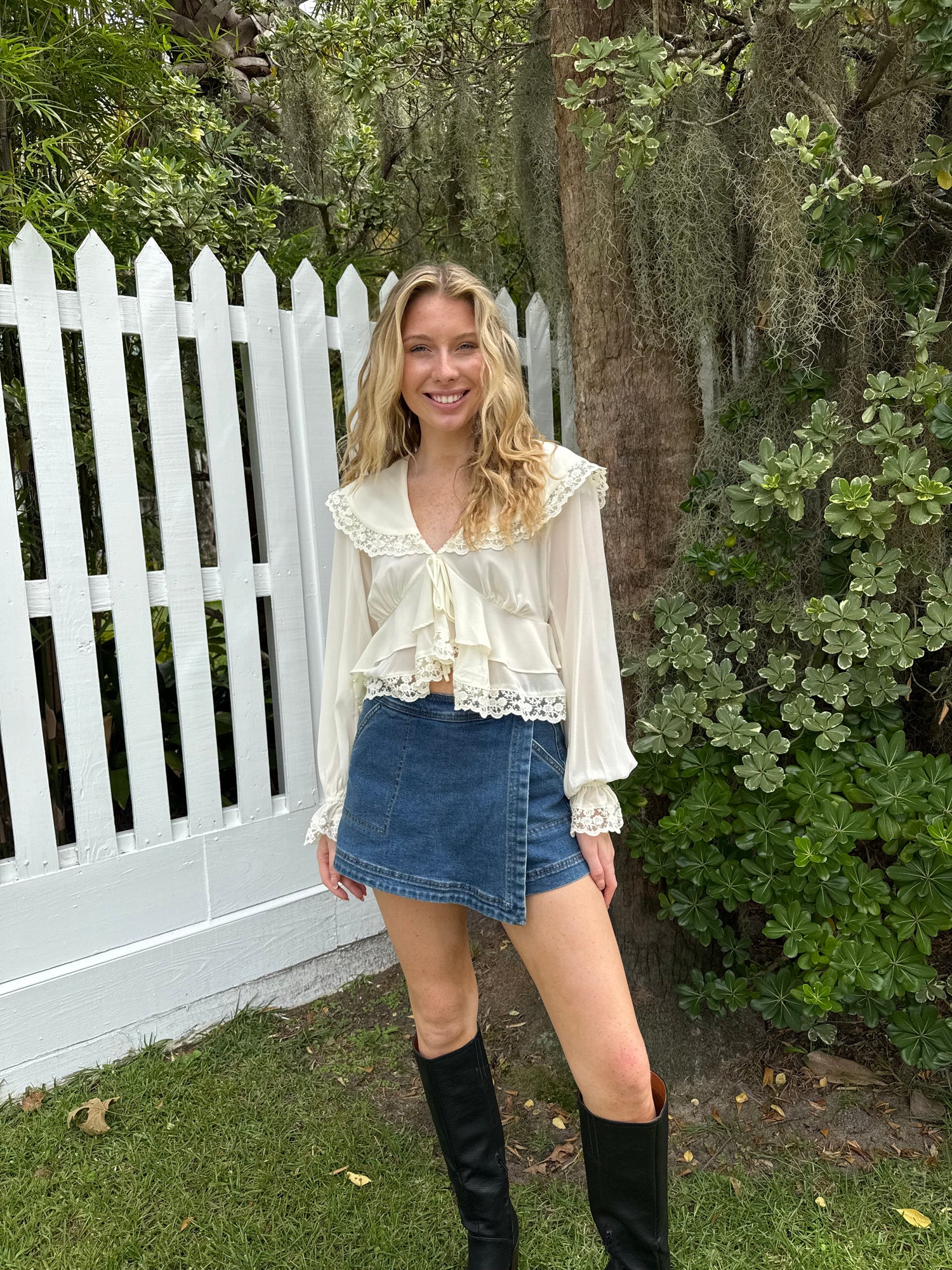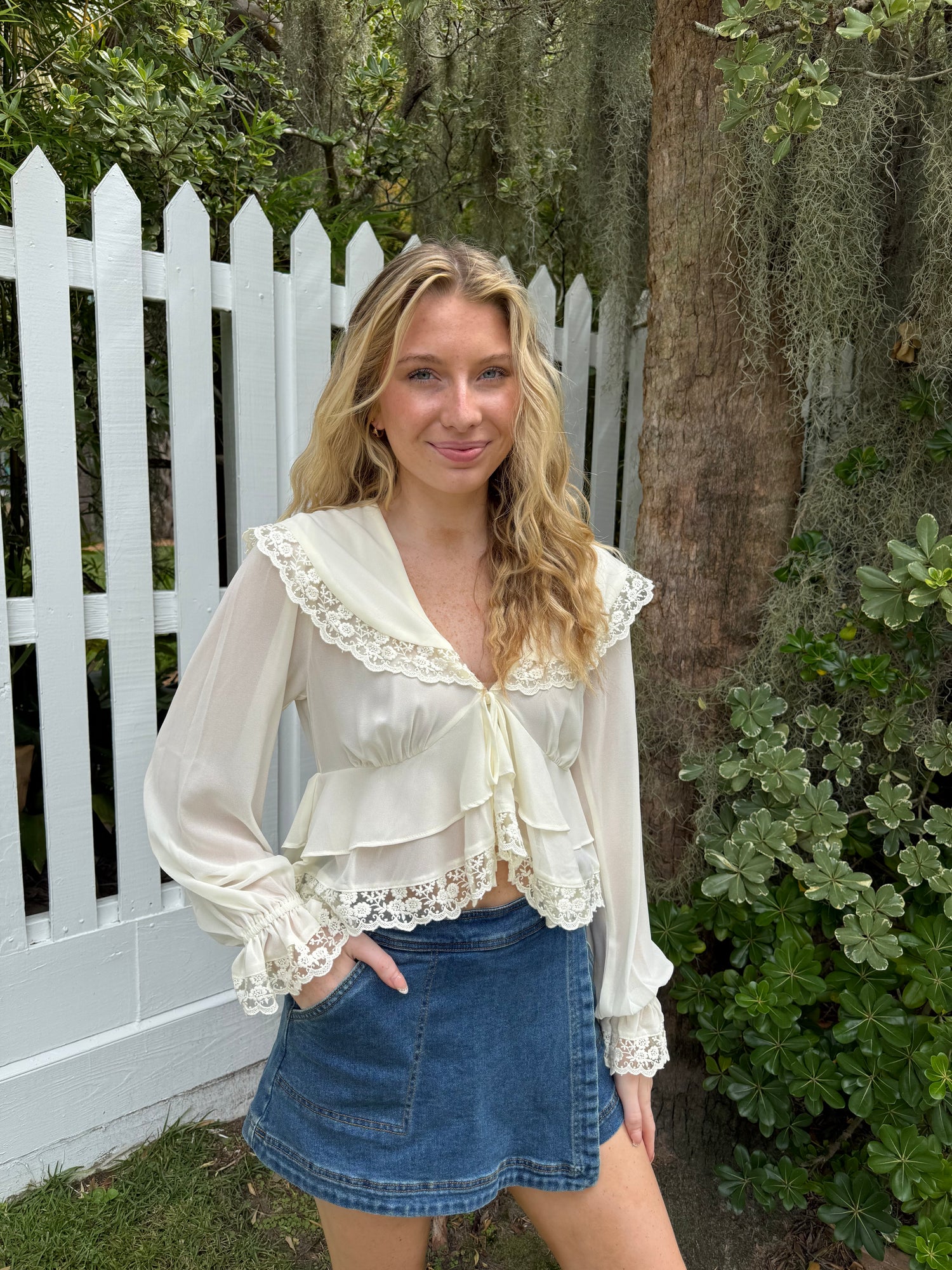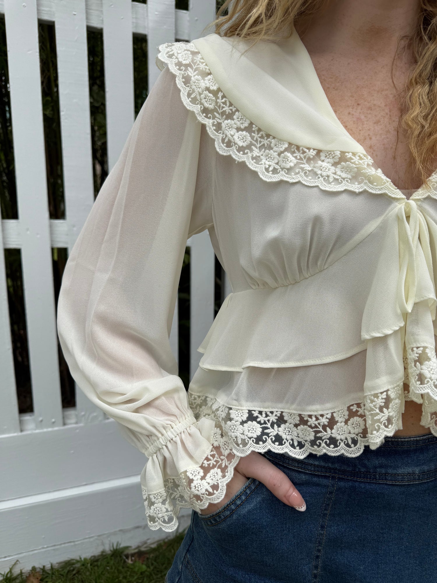Elevate your style with our Chiffon Top with Lace Detailing! This cream-colored top is designed with delicate lace detailing and a bow tie in the front for a customizable fit. Made of chiffon, it's perfect for any occasion. Look and feel confident in this must-have piece!