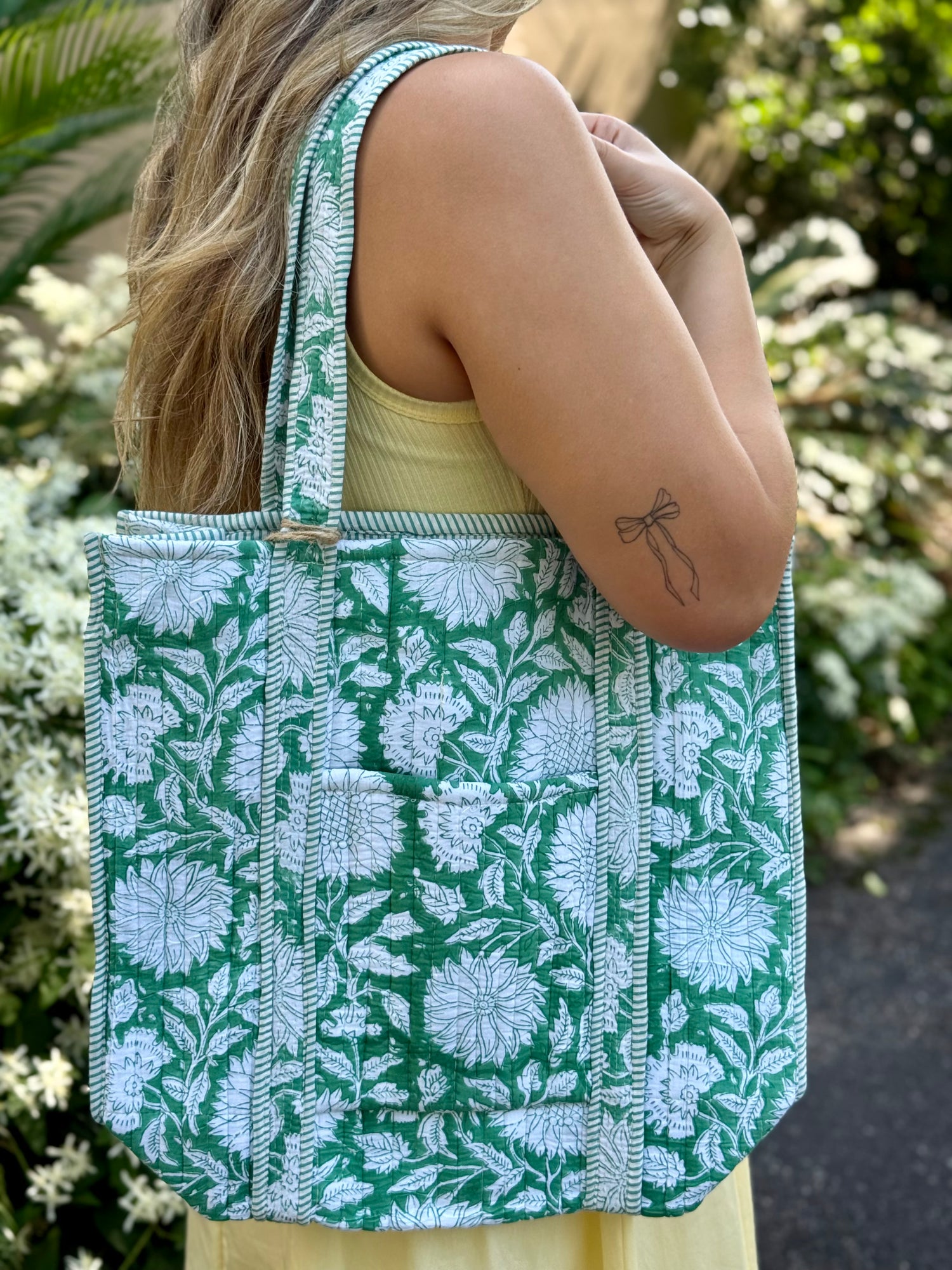 The Dande Quilted Tote is perfect for your on-the-go lifestyle! Made of high quality quilted material, this tote features a beautiful dandelion pattern with a striped interior. With pockets on the inside and outside, it's perfect for staying organized. Plus, it comes with a coin purse for added convenience. Stay stylish and organized with the Dande Quilted Tote!