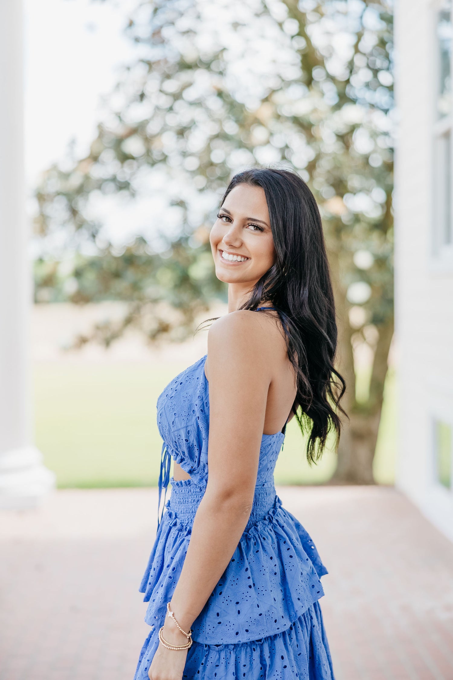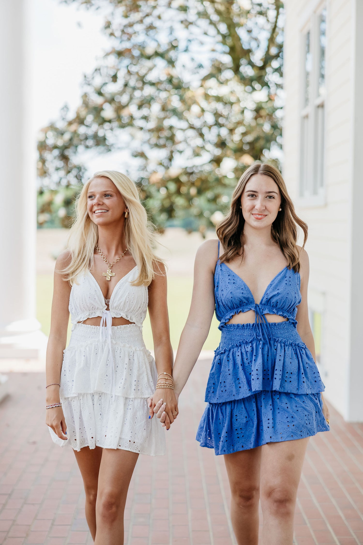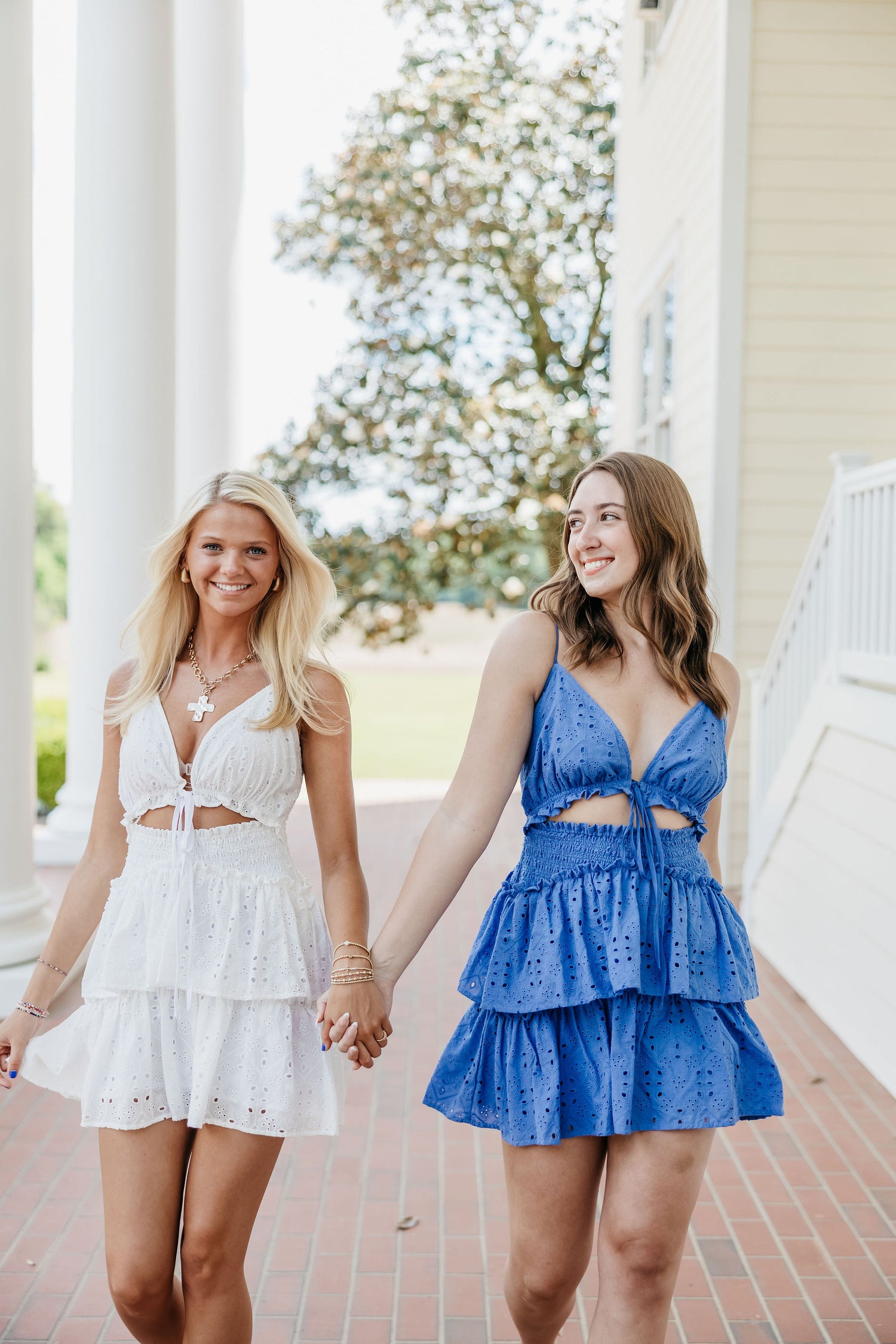 Get ready to turn heads in the stunning Leigh dress! It features adjustable straps and a waist, with a beautiful cut-out and ruffle bottom in a gorgeous blue and white color. Perfect for any summer occasion, this dress is crafted with quality and has a zipper back. Don't miss out on this versatile and stylish piece!