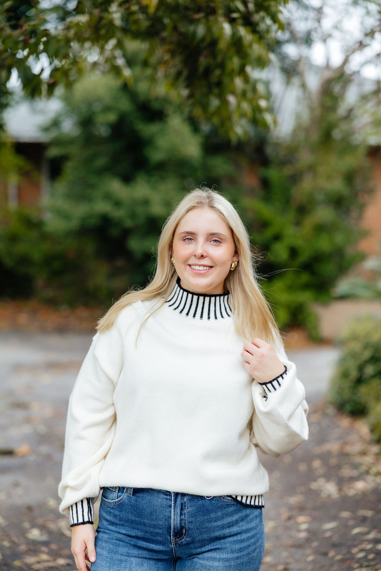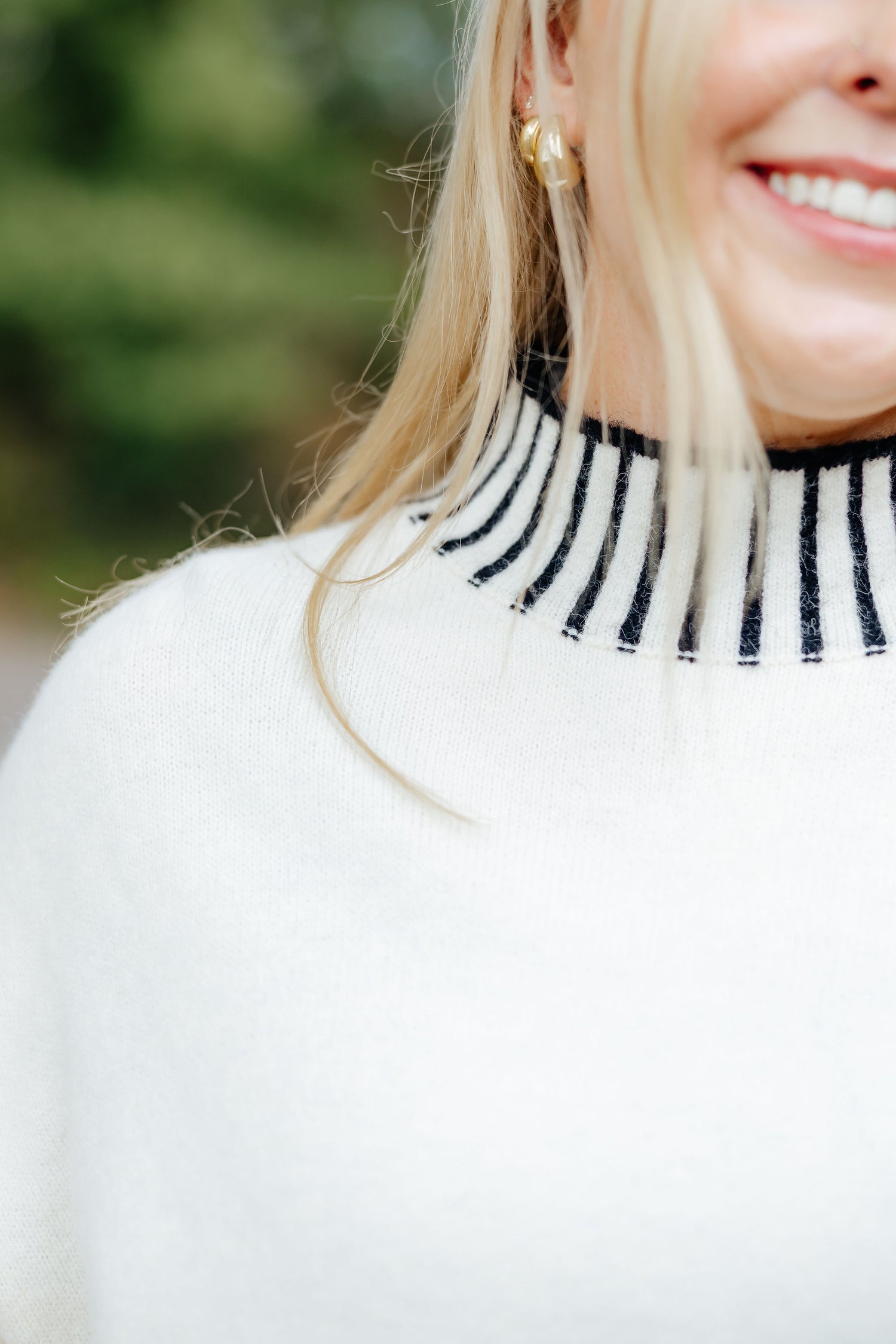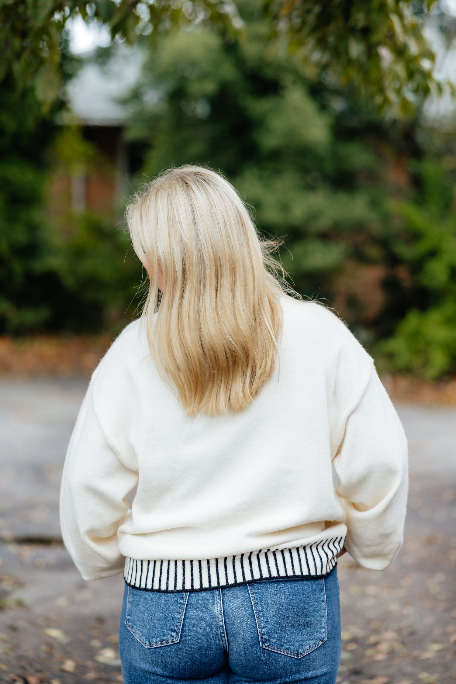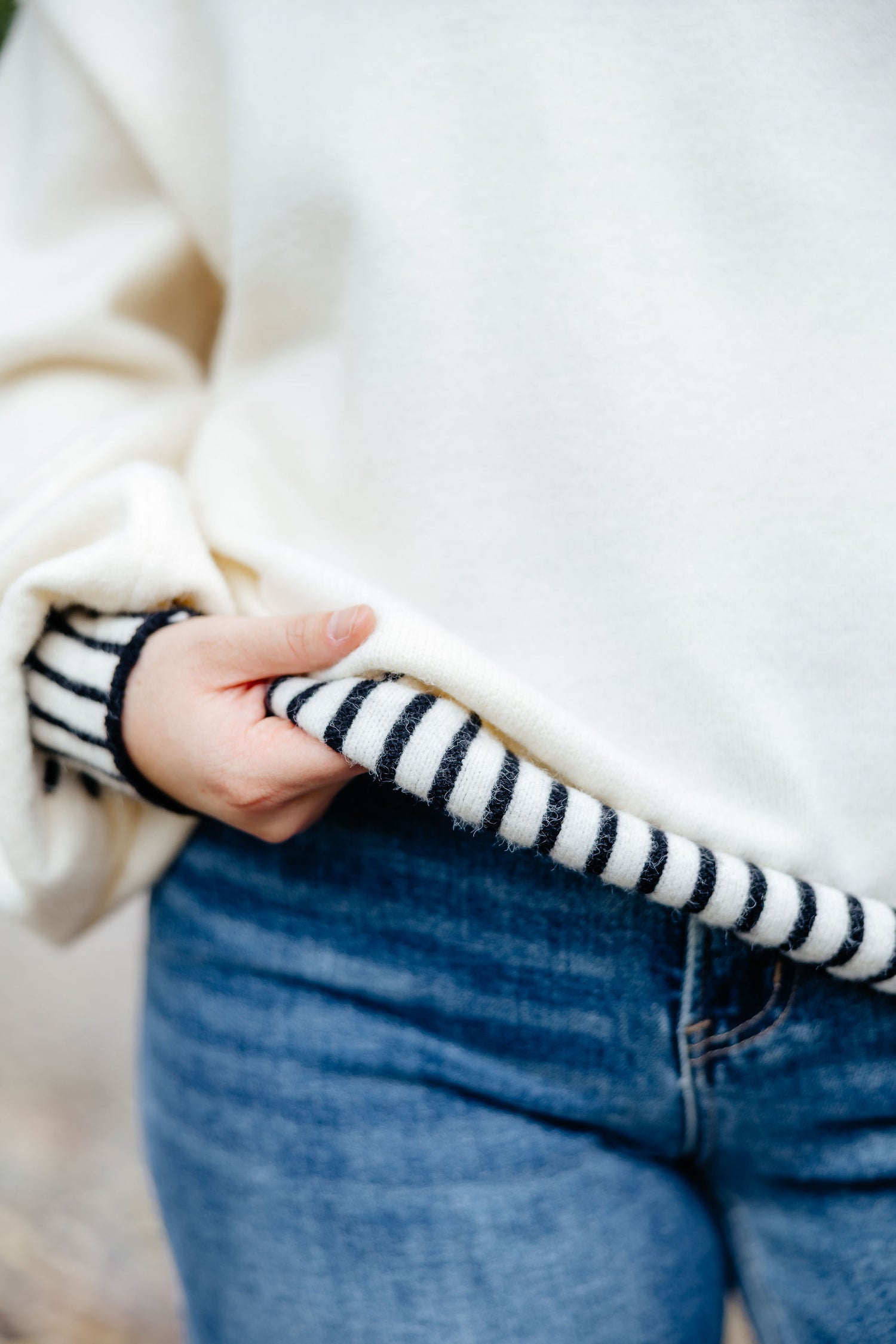 Indulge in the cozy comfort and chic style of the Nora Top. This top features striking black and cream stripes along the neck and sleeves, adding a touch of elegance to your fall wardrobe. Stay warm while looking effortlessly fashionable. Every fashionista's must-have!