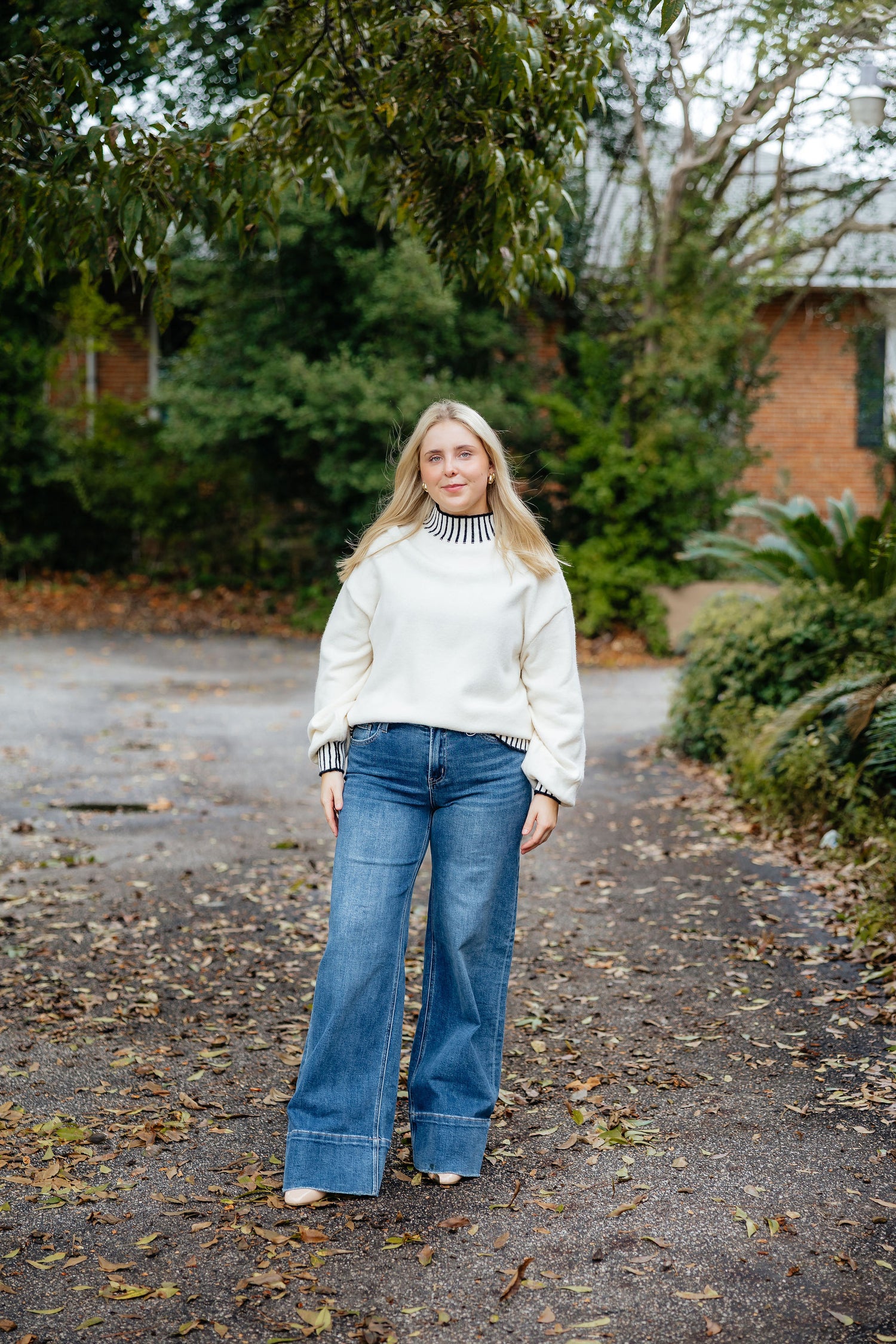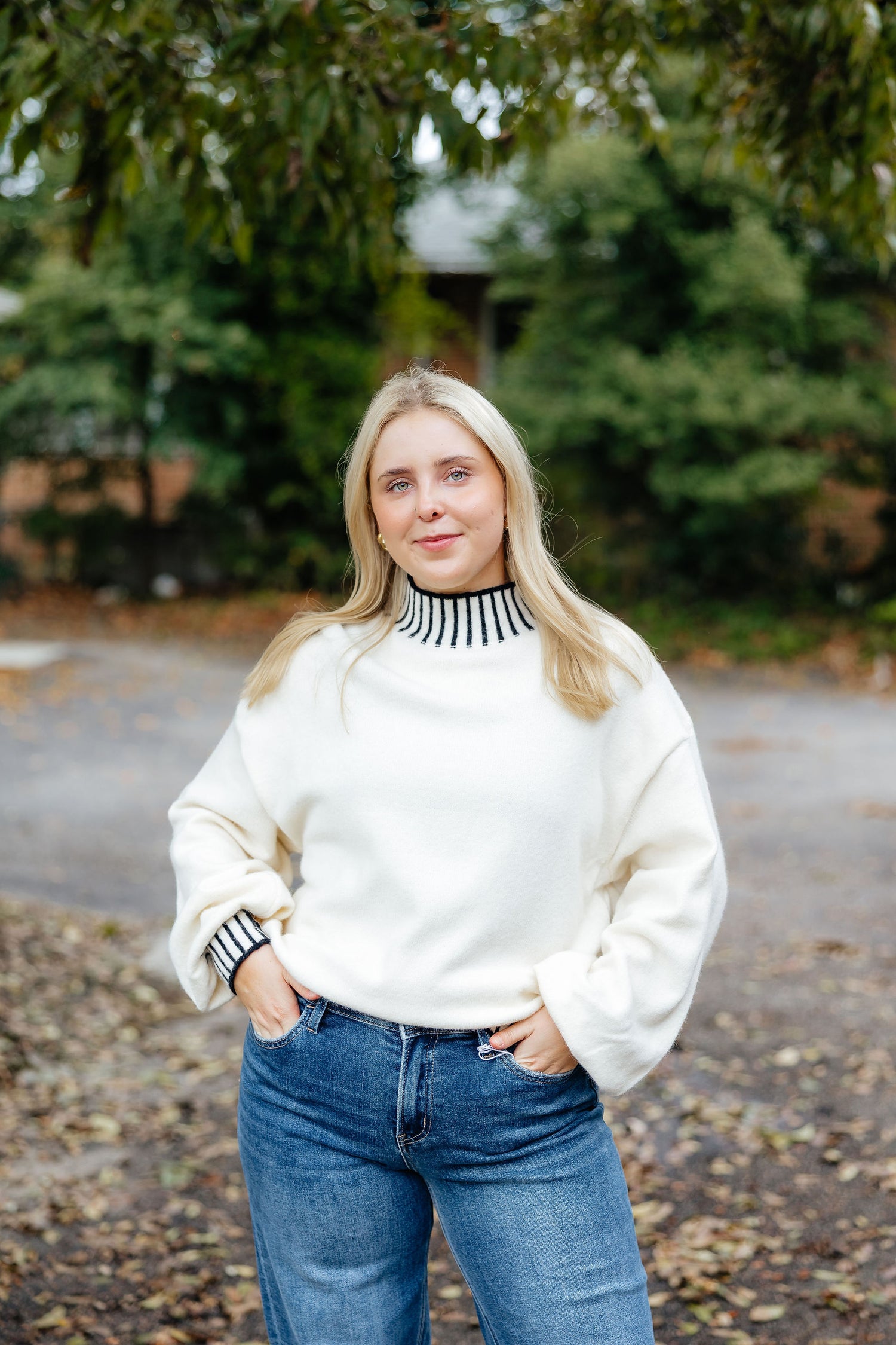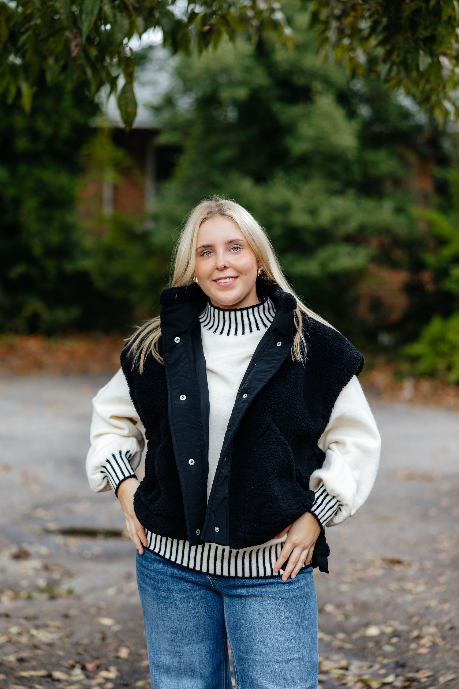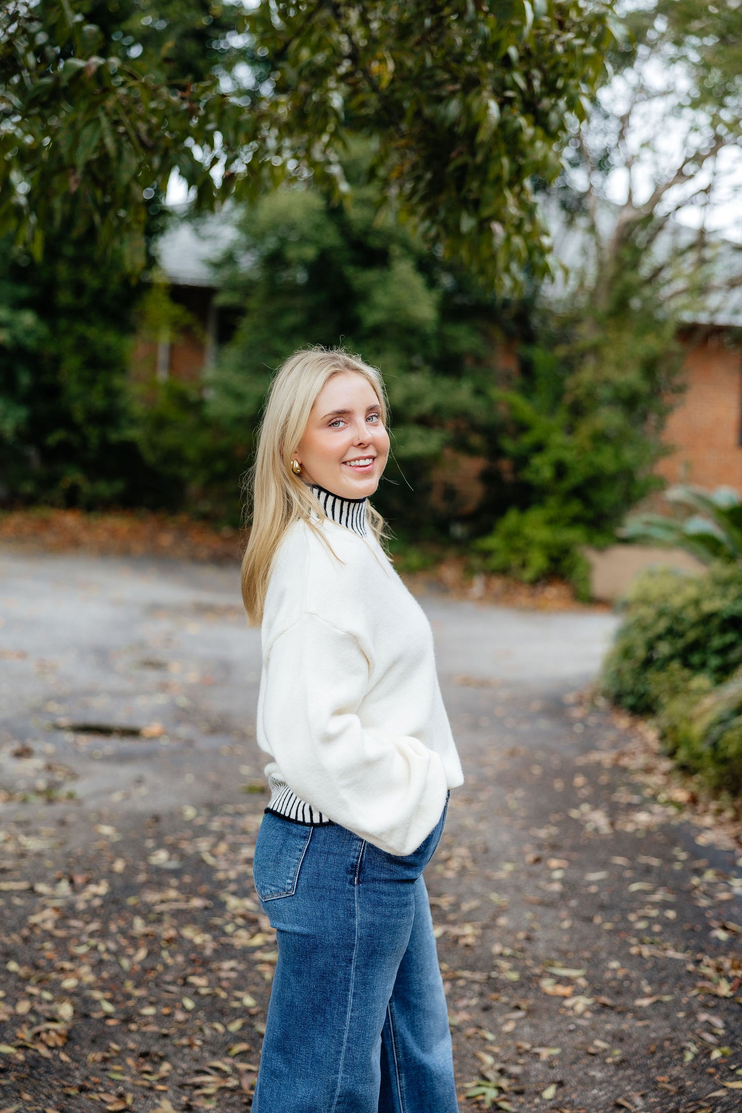 Indulge in the cozy comfort and chic style of the Nora Top. This top features striking black and cream stripes along the neck and sleeves, adding a touch of elegance to your fall wardrobe. Stay warm while looking effortlessly fashionable. Every fashionista's must-have!
