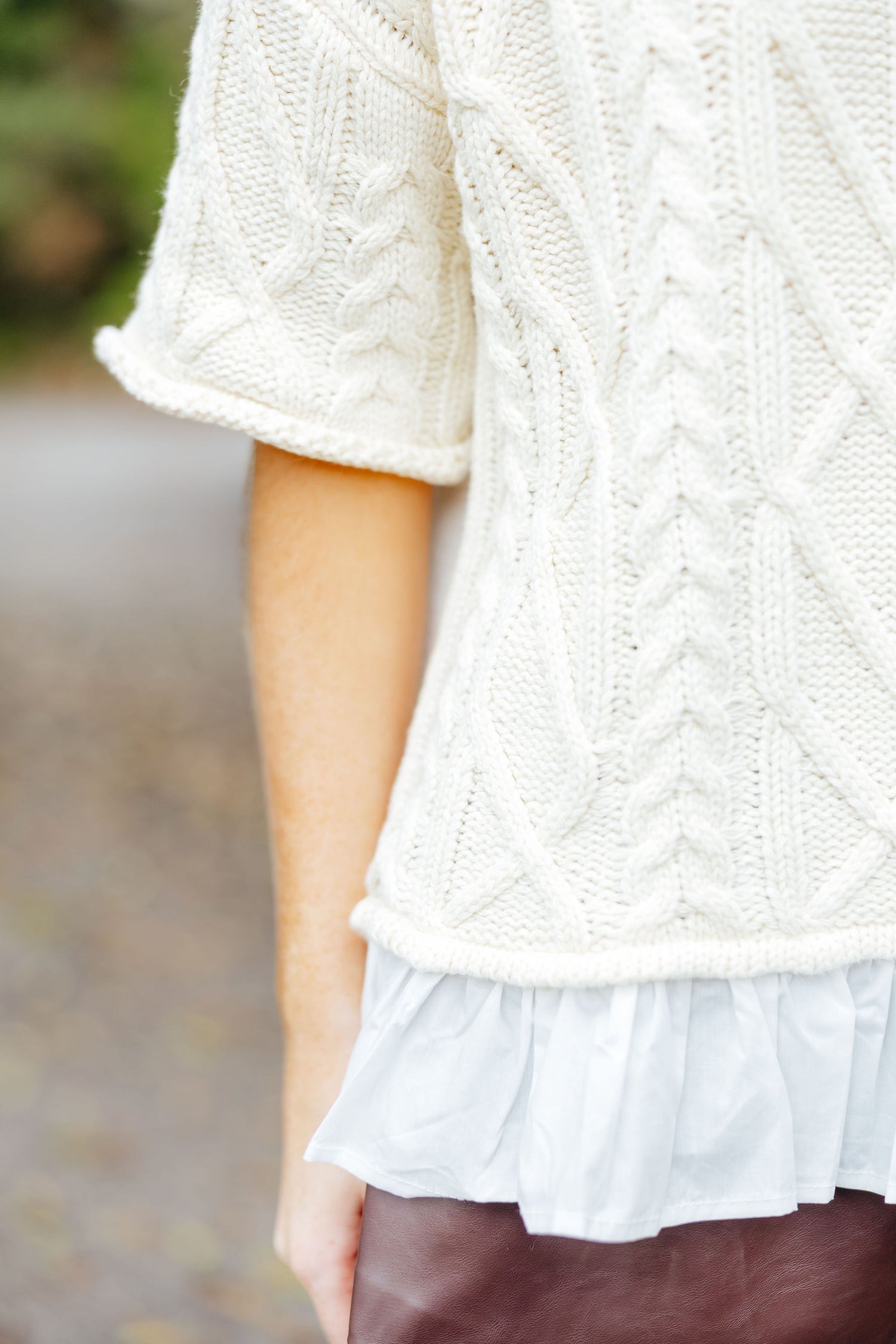 Get ready to cozy up in style this fall with our elowen sweater Featuring a charming ruffle trim on the bottom and a thick, intricate cable knit design, this short-sleeved sweater is the perfect blend of comfort and cuteness. Perfect for those chilly southern days, our top will keep you looking and feeling great all season long.