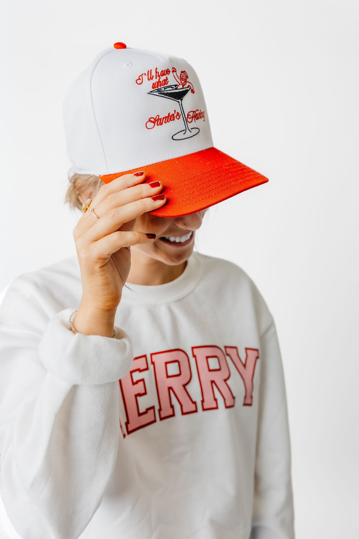 Spread some festive cheer with What Santa's Having! This classic red hat features an embroidered design and a playful Santa in a martini glass. Perfect for adding some holiday spirit to your outfit!