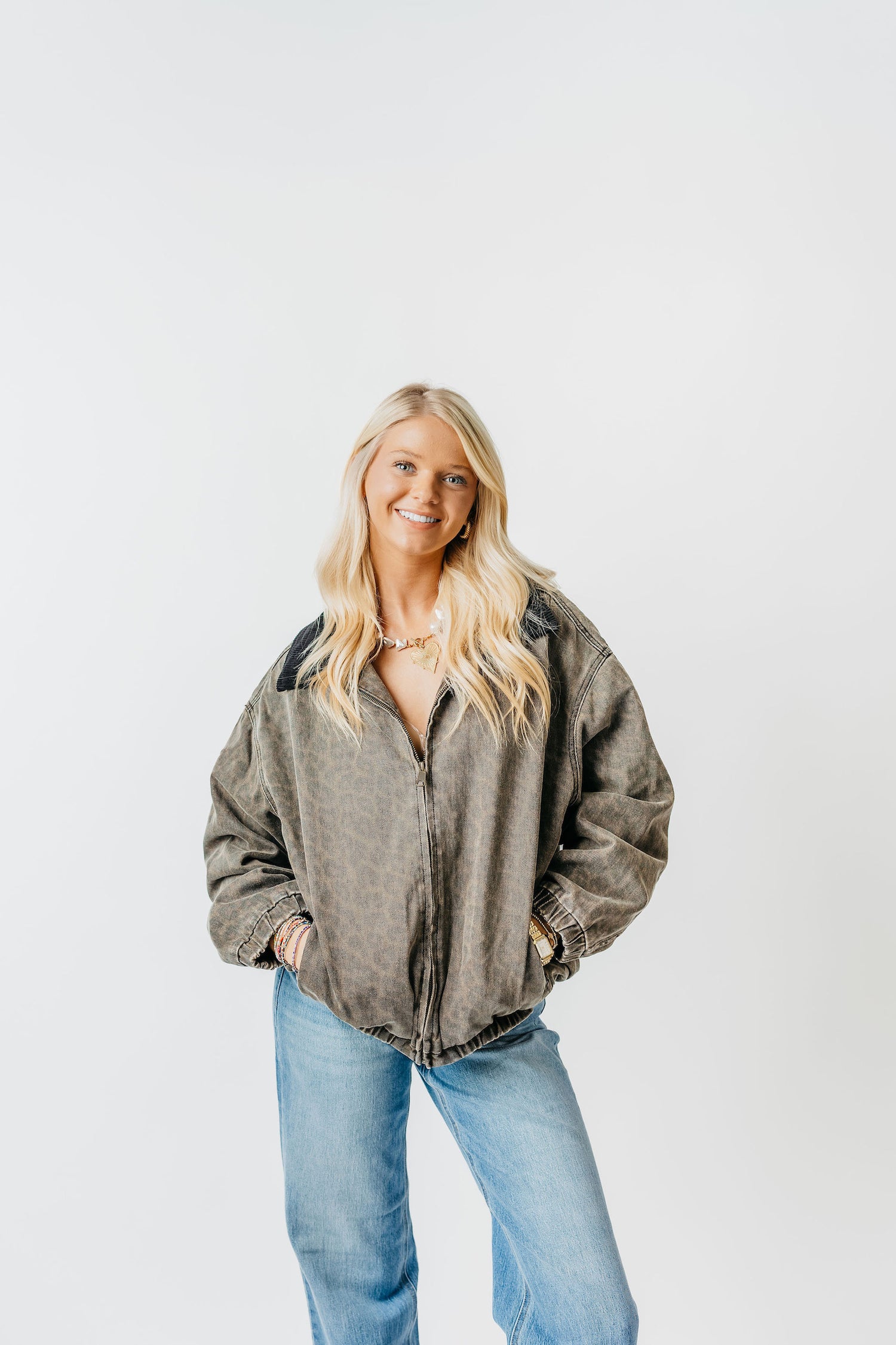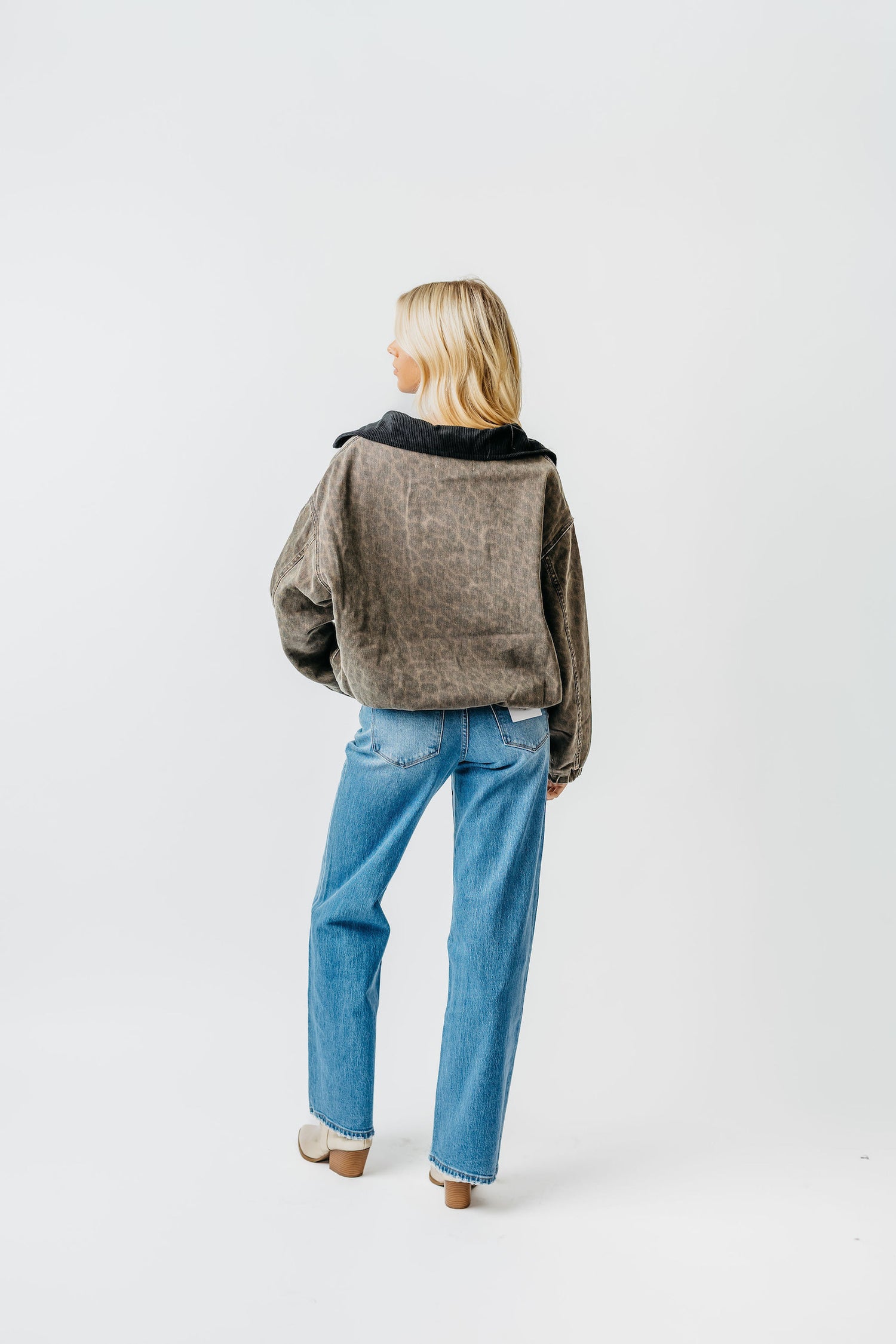 Stay warm and stylish with the Leopard Print Bomber. Featuring a cozy quilted interior and a soft corduroy collar, this jacket offers comfort and warmth during the coldest months. The deep-washed leopard print adds an edgy touch, while the stretch bottom ensures a flattering, fitted silhouette. Perfect as a standout layer, this bomber effortlessly elevates any outfit with a blend of bold design and practical warmth.